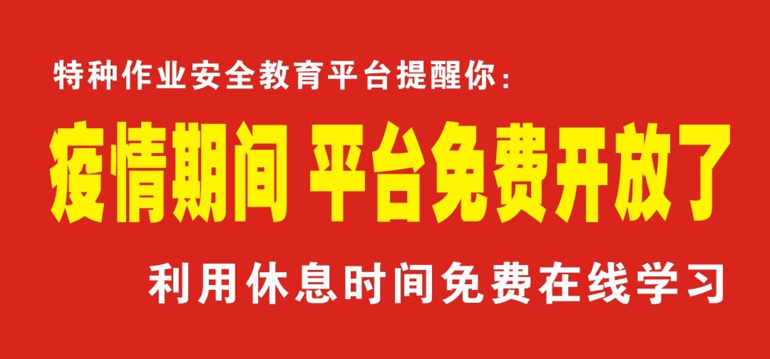 特种作业安全教育平台: 积极响应开展【在线学习】【网上学习】的号召,针对疫情期间,平台内所有培训在线课程、模拟考试练习。 即日起至2020年4月1日(暂定),平台内所有课程【全部免费】对外开放,望广大学员相互转告。 利用休息时间。自行学习备战《特种作业人员操作证》、《特种设备安全管理员与作业人员》证书取证、考试,而准备。 活动结束时间以特种作业安全教育平台公示通知时间为准!